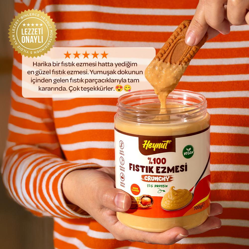 Sadece tadı değil, dokuyu da hissetmek isteyenler için: Heynut Crunchy! %100 yer fıstığı ezmesinin yumuşacık kreması ile iri kıyım fıstık parçacıklarının mükemmel uyumu.