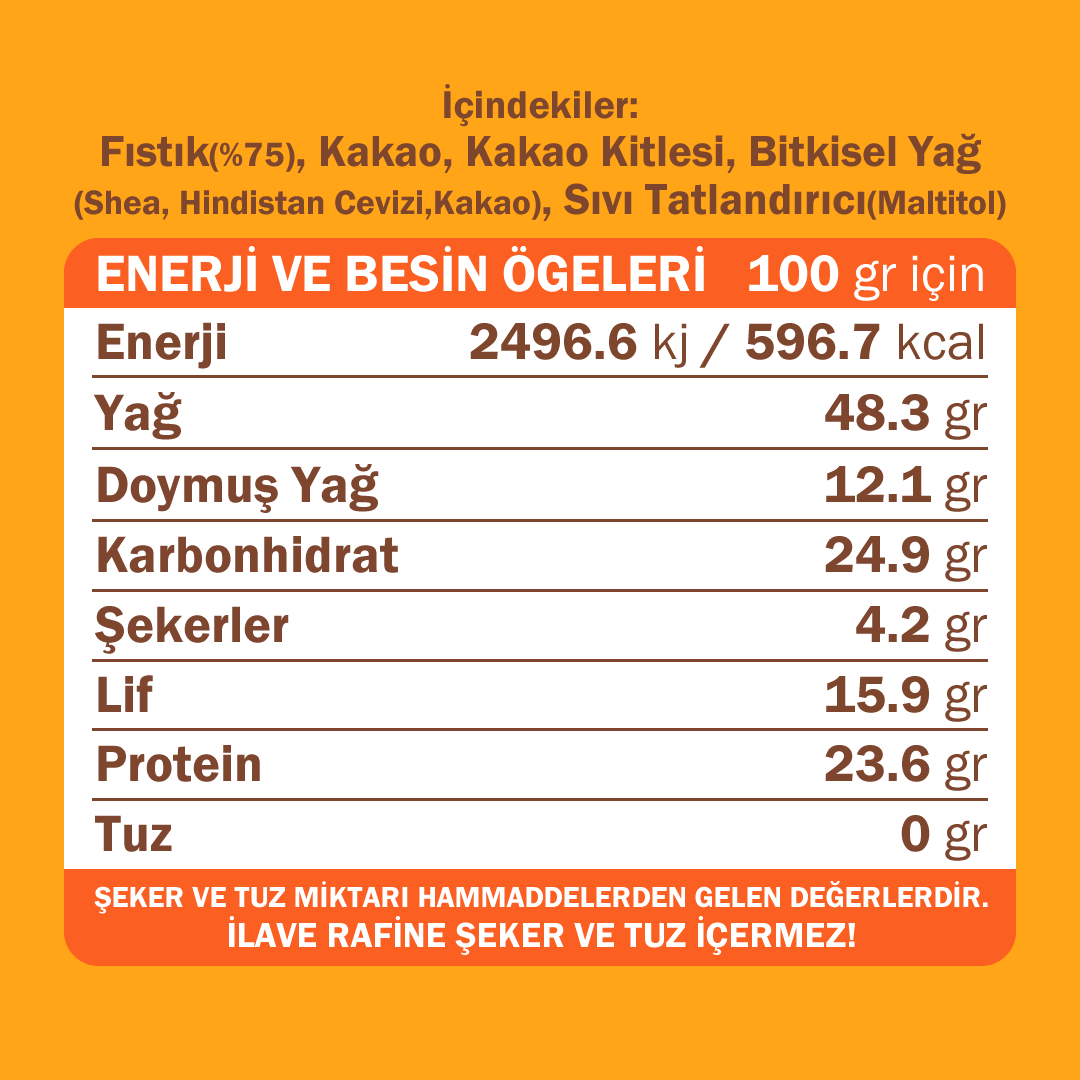 İçindekiler : Fıstık (%75),Kakao,Kakao Kitlesi,Bitkisel yağ(Shea,Hindistan Cevizi,Kakao),Sıvı Tatlandırıcı(Maltitol)