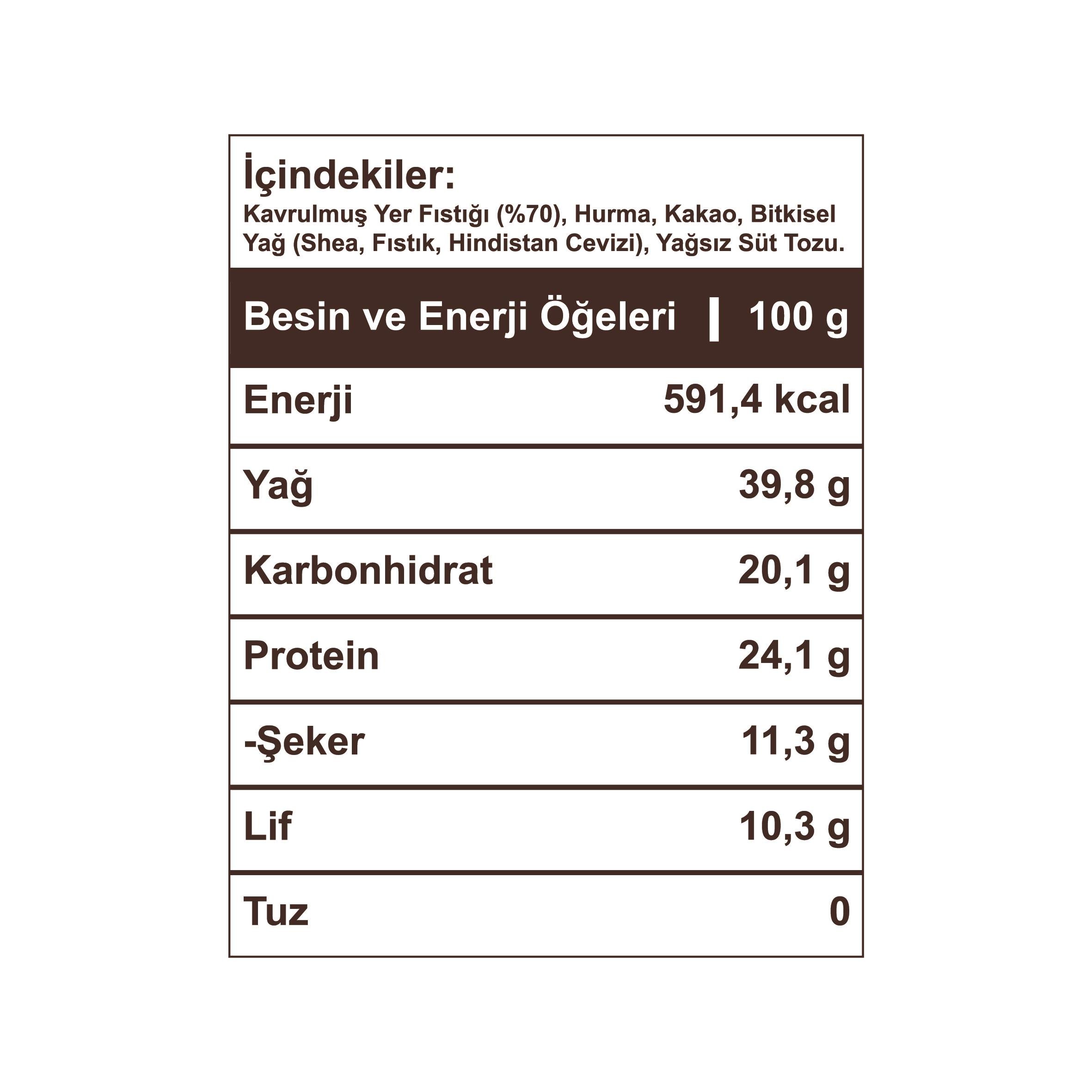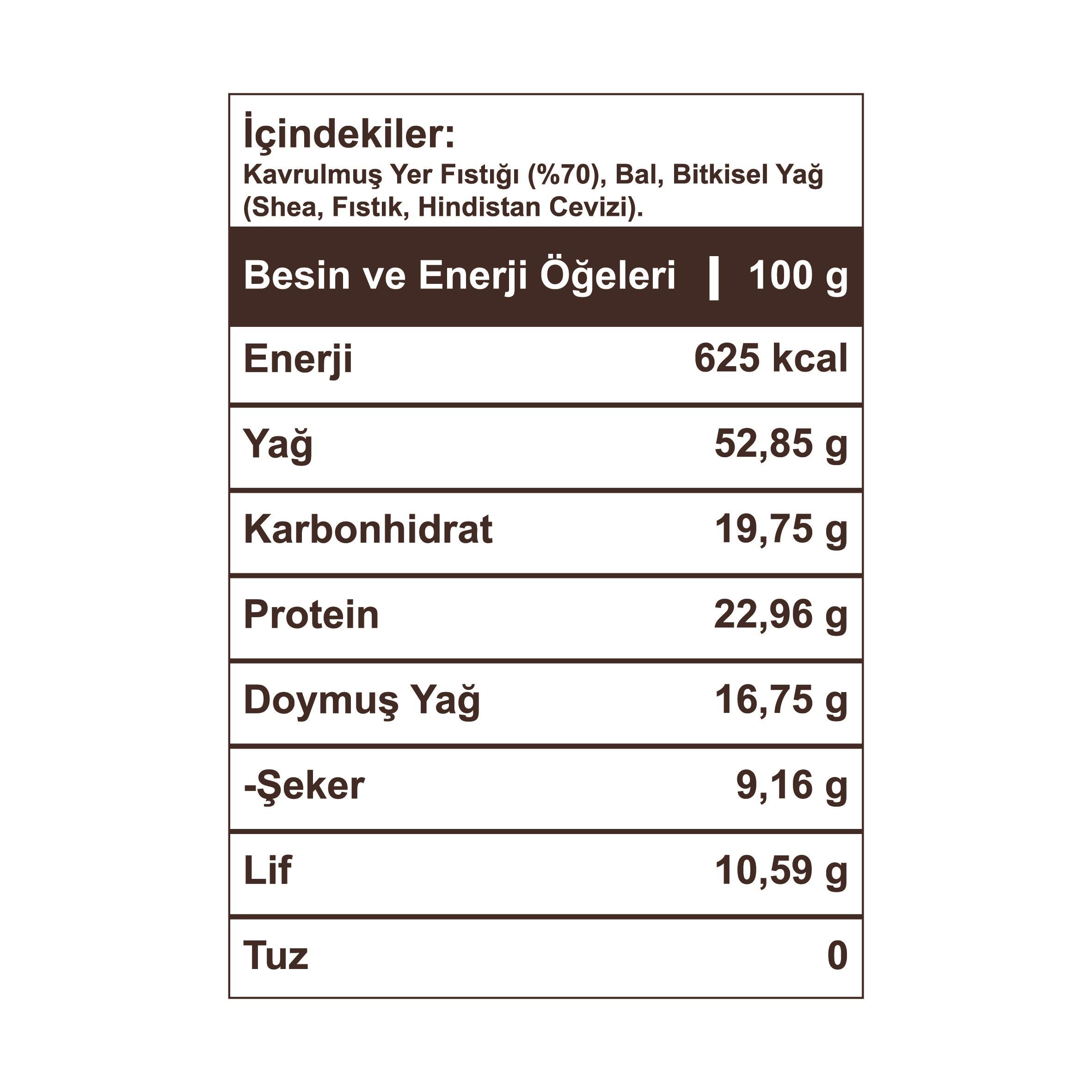 Birinci sınıf Osmaniye yer fıstıkları ile GÜNLÜK ve TAZE olarak üretiliyor. Aflatoksin analizlidir. Yüksek lif içeriği ile sindirime dosttur. Aynı zamanda vegan dostu olan bu fıstık ezmesinin içeriği tamamen doğal ve bitkiseldir. Sağlıklı ve lezzetli bir tercih olarak, günlük beslenmenizdeki ihtiyaçlarınızı karşılamak için idealdir.
